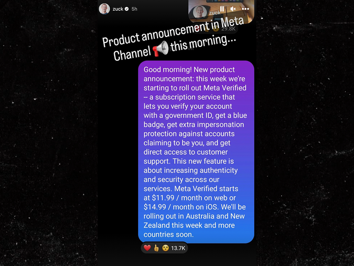 “Bom dia e o anúncio de um novo produto: esta semana estamos lançando o MetaVerified — serviço de assinatura que permite que você verifique sua conta com uma identificação do governo, tenha um crachá azul, proteção extra contra contas que afirmam ser você e que permite acesso direto ao suporte ao cliente”,